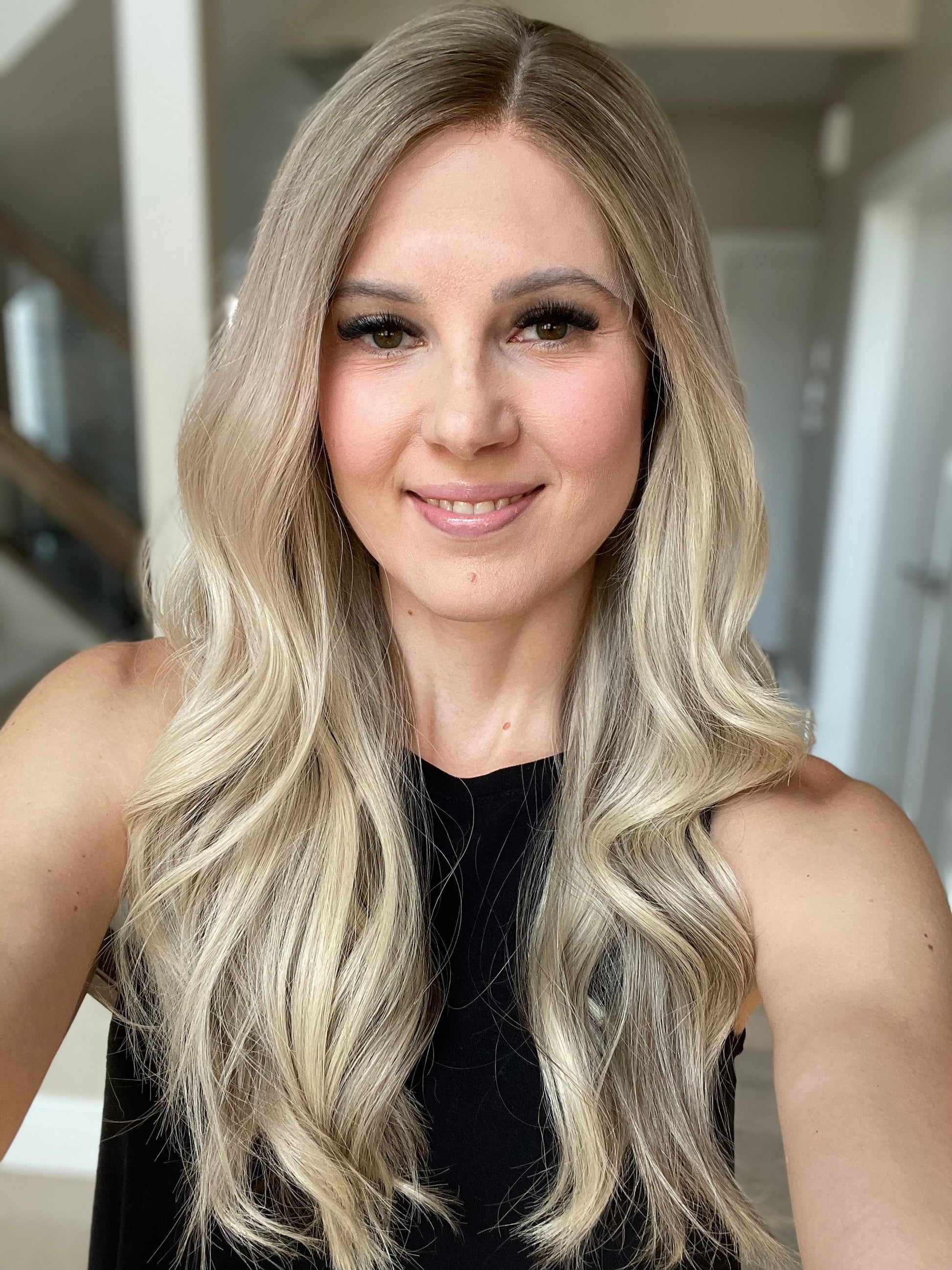 * Color: Neutral blonde with an any dark blonde reverse balayage root and darker blonde dimension.