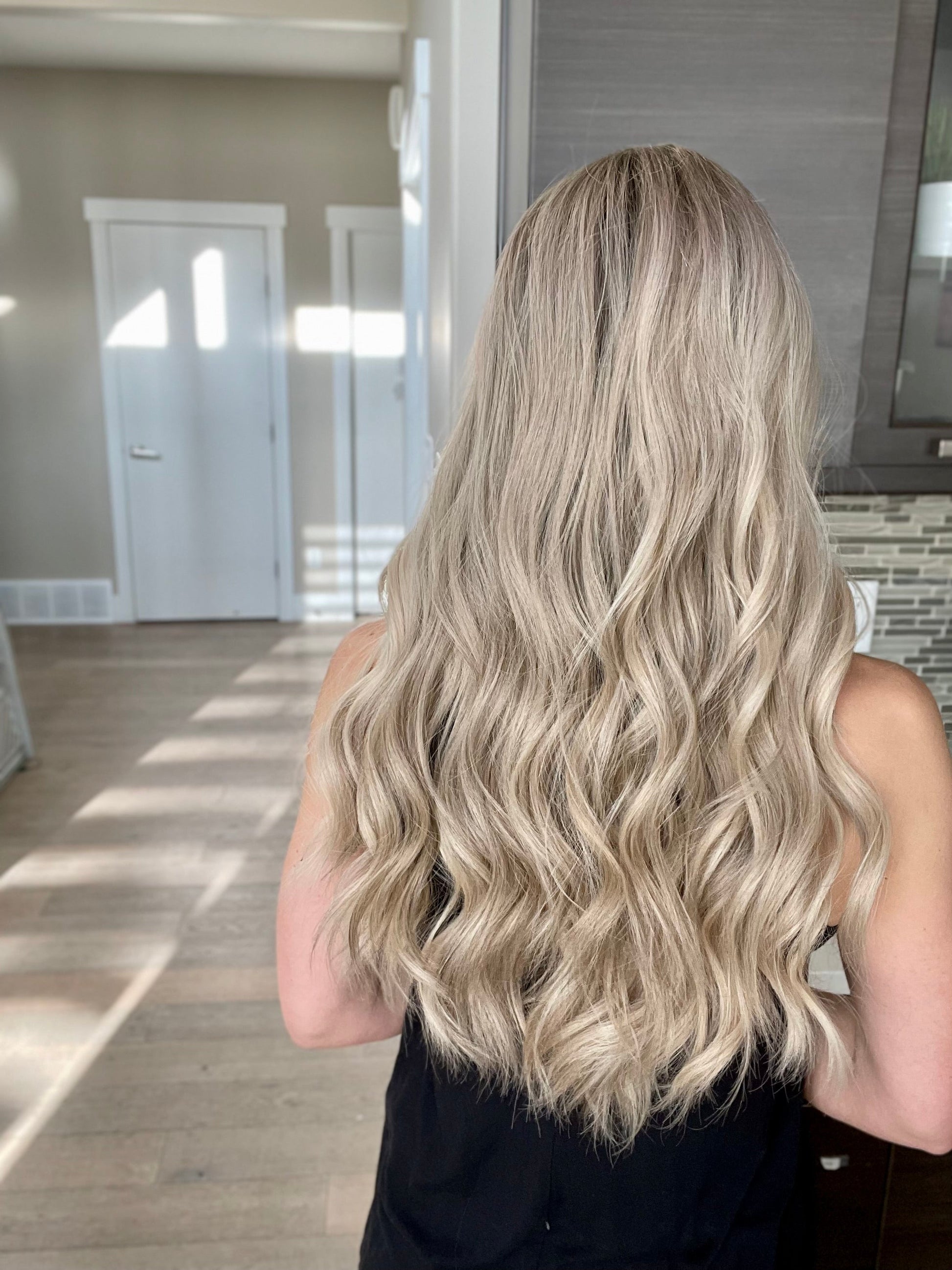 * Color: Light to medium cool blonde with ashy darker blonde reverse balayage and added dimension.