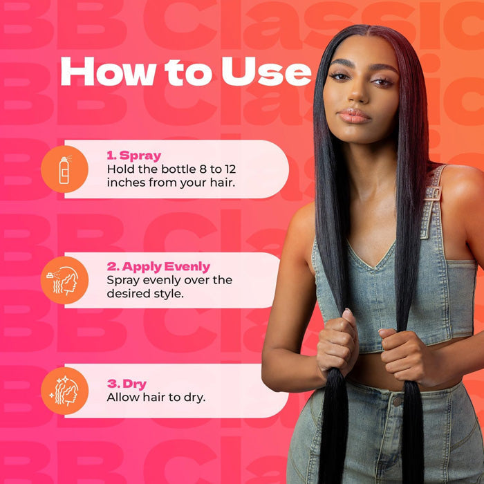 Hold bottle 8 to 12 inches from hair. Spray evenly over desired style. Allow hair to dry.