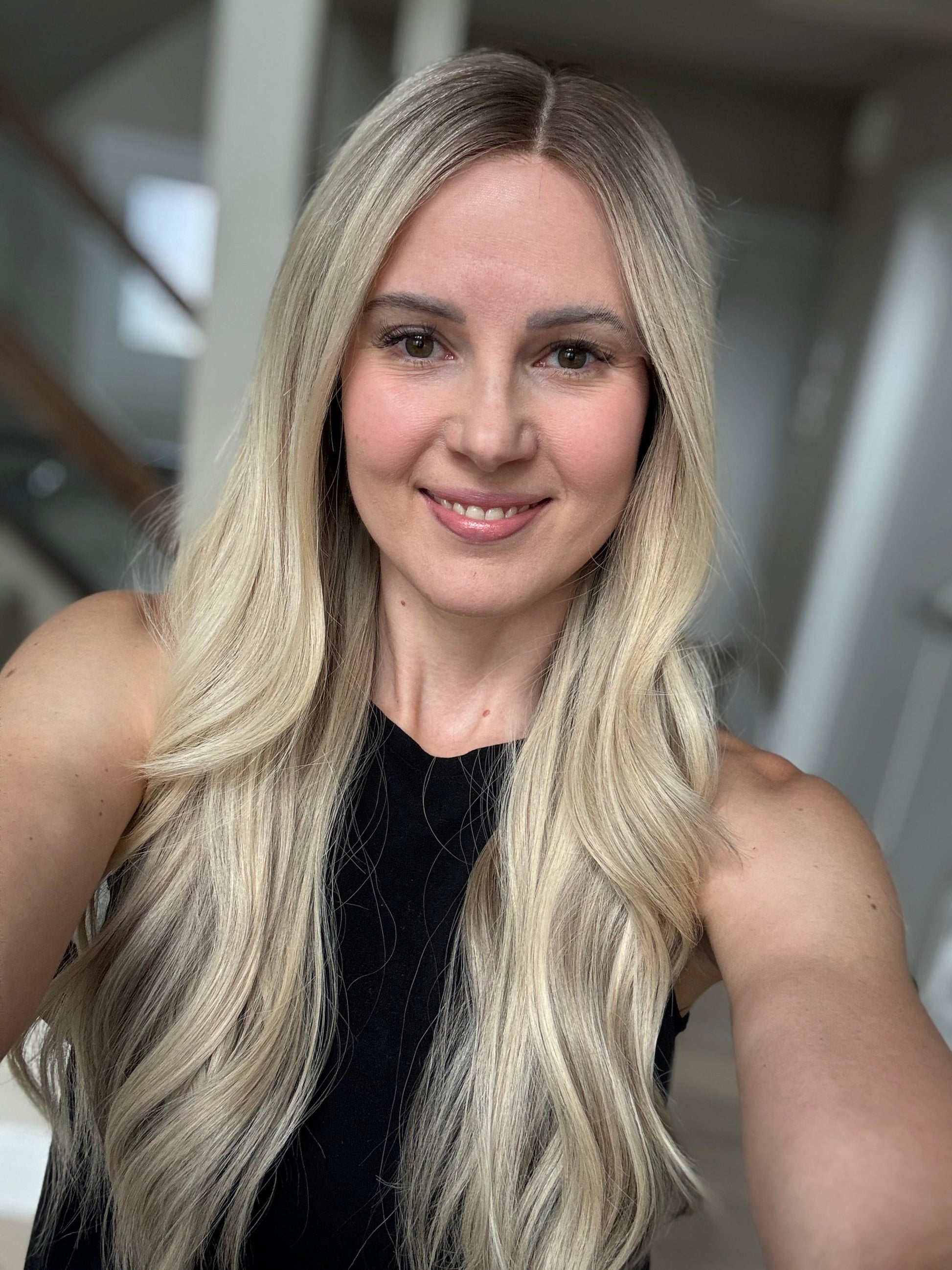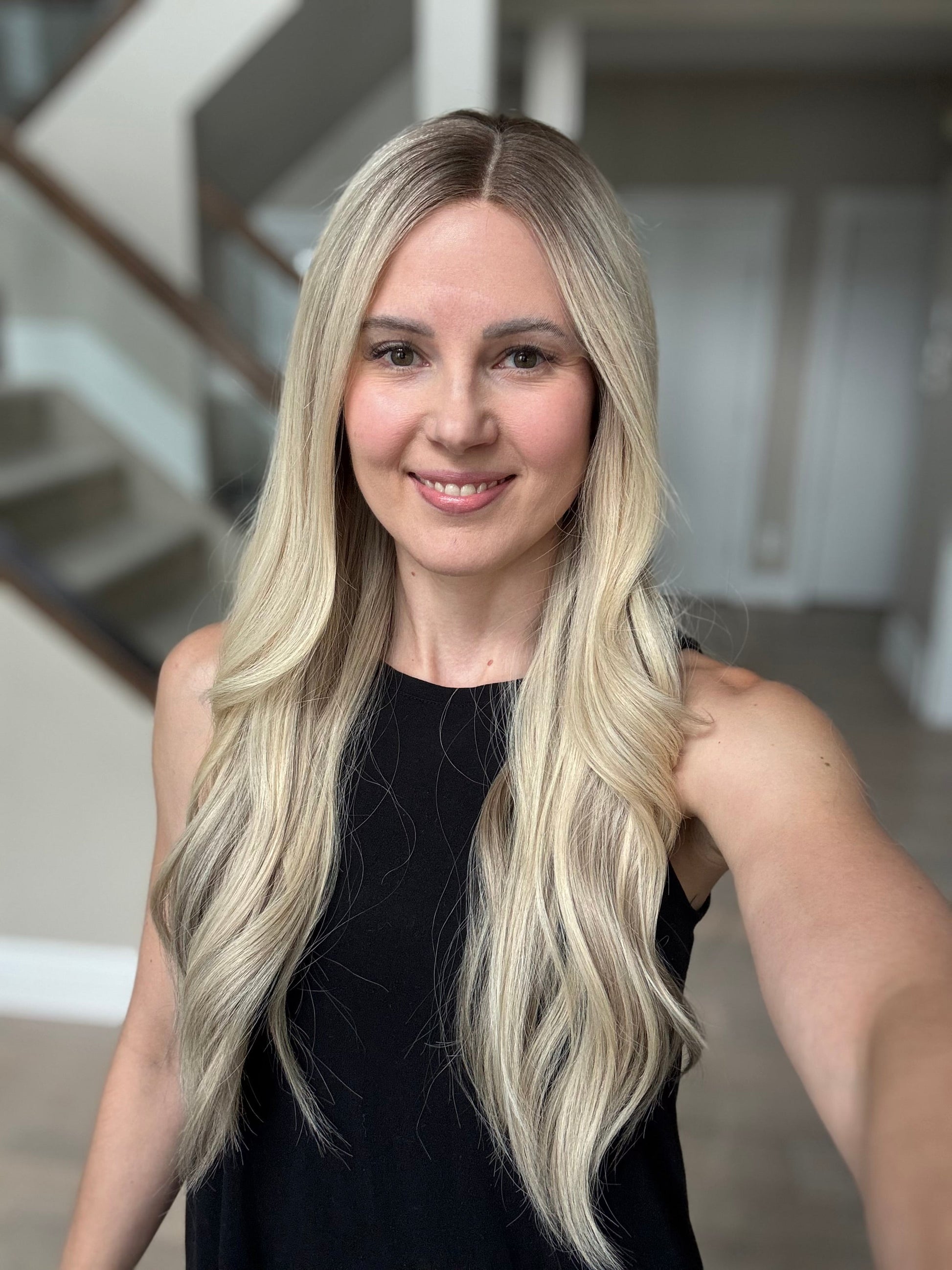 * Color: Light to medium cool blonde with ashy darker blonde reverse balayage and added dimension.