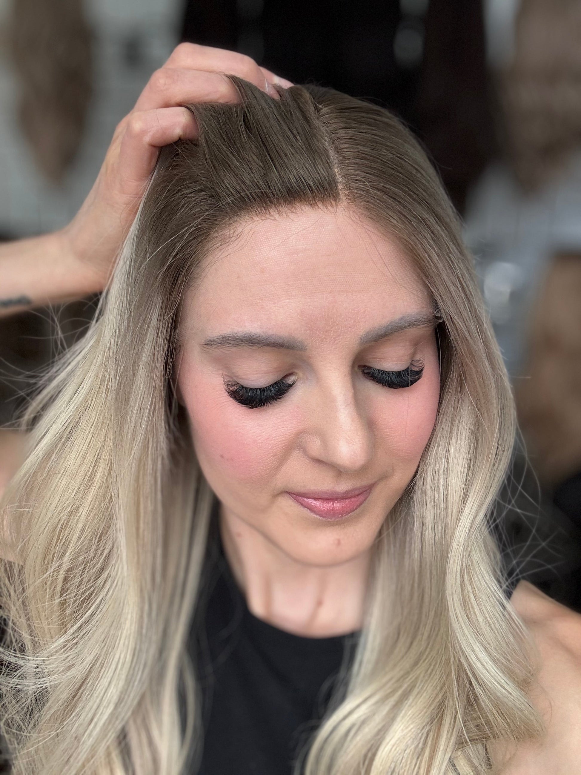 * Please note wig is shown with a small amount of face powder dabbed into the part-line for demonstration purposes. We recommend clients use powder rather than bleaching the knots as it extends the longevity of the wig and often looks more realistic.
